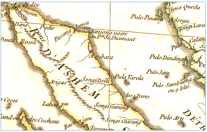 Dalam Kamus Geografi tahun 1710 daerah penting di Sumatra hanya menyebut Achem, Lamby, Palamban, Pedier, Andragire. Ini berarti Aru tidak dianggap lagi daerah penting. Setelah lebih dari satu abad, pada peta Portugis yang diterbitkan pada tahun 1750, nama Deli sebagai nama suatu tempat baru muncul. Tempat ini disebut oleh orang-orang Portugis dengan nama Dilli (adakah relevansinya dengan Dilli di Pulau Timor?). Bandar Deli ini berada di hulu sungai Deli di pedalaman (sebagaimana Pertibie di pedalaman sungai Baroemoen). Di dekat muara sungai Deli sendiri terdapat satu muara sungai lagi (Sungai Belawan atau Sungai Boeloe Tjina atau sungai Hamparan Perak) yang mana kedua sungai ini airnya masuk ke teluk Belawan. Tampak dalam peta bahwa pulau Belawan sudah ada, tetapi (delta) Pulau Sitjanang belum muncul. Dalam peta Perancis (1752) nama Deli teridentifikasi sebagai nama sungai Songi Delli. Dalam peta Perancis ini Ambara atau Ambuara berada di sebelah utara Deli. .